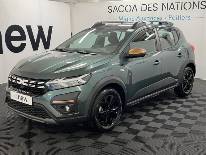 TCe 90 GSR2 Stepway Extreme, essence, vert, 05/03/2025, Direction assistée, Peinture opaque, Lève-vitres AR électriques, Projecteurs antibrouillard, ESP+ASR, Condamnation des ouvrants en roulant, Rétroviseur intérieur jour/nuit, Fonction éco-mode, Eclairage du coffre, Système anti-blocage des roues, Kit de gonflage, Aide au parking AR, Lève-vitres AV électriques, conducteur impulsionnel, Système de fixation Isofix, Caméra de recul, Carte mains libres, Rétroviseurs extérieurs électriques et dégivrants, Climatisation automatique, Volant réglable en hauteur et en profondeur, Détection de pression des pneus, Allumage des feux et essuie-glace automatiques, 3 appuis-têtes AR, Barres de toit modulables, Console basse + rangement ouvert, Siège conducteur réglable en hauteur + accoudoir AV, Volant Soft Feel TEP, Airbag frontal conducteur et passager, Airbag latéral avant : thorax + rideau, Assistance au freinage d'urgence + allumage des warnings, Bouton appel d'urgence, Feux arrières avec signature lumineuse Y, Banquette AR rabattable 1/3-2/3, Signature lumineuse DACIA en Y à LED, Feux de jour à LED, Rappel de bouclage de ceintures, Condamnation centralisée des portes, Régulateur et limiteur de vitesse, Antenne requin, Stripping Extreme, Sellerie spécifique Extreme avec surpiqures brun cuivré, Extended Grip, Plancher de coffre double niveau, Rétroviseurs extérieurs Brun Cuivré, Jantes alluminium 16'' MAHALIA diamantée noir avec cabochon Brun Cuivré, Tableau de bord avec écran numérique 3, 5'' et compteurs analogiques, Système de freinage d'urgence avancé, Système de surveillance de l'attention du conducteur, Reconnaissance des panneaux de signalisation avec alerte de survitesse, Prédisposition Ethylotest, Alerte franchissement de ligne et assistant maintien dans la voie, Media Display, Boîte de vitesse automatique 6, Boîte de vitesse manuelle 6